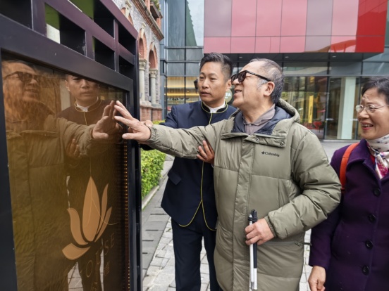 在思南公馆,残障人士通过触觉、嗅觉等多感官互动,沉浸式感受建筑艺术与人文底蕴。在志愿者一对一的陪同下,参与者触摸铜板雕刻、拉毛墙面,嗅闻芳香植物,以独特方式“品读”城市文化。思南文学之家内,残障人士与驾驶员共话阅读感悟,文创纪念品更添温情回忆。