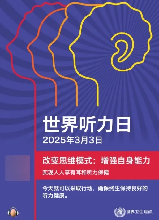 2025年3月3日是第26个“全国爱耳日”,主题为“健康聆听,无碍沟通”。3月3日也是世界卫生组织设立的“世界听力日”。今年全球主题是:“改变心态:赋予自己权力,让所有人的耳朵和听力保健成为现实!” 这不仅是对听力健康的呼吁,更是推动社会共同关注听力障碍群体的重要契机。