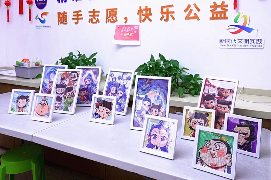 经过学员们的共同努力,十多幅“哪吒”系列钻石贴画“诞生”了。为了让更多人能看见学员们的努力成果,服务基地决定将这些作品摆放进彭浦新村街道辖区里的6个雷锋志愿服务亭义卖,义卖所得全部用于学员们后续的技能提升培训和社区残健融合,实现受助者自助。