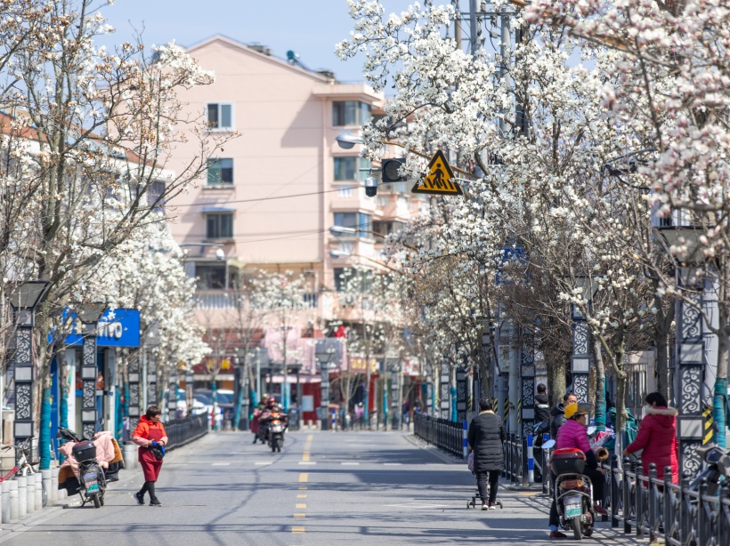 据了解,2019年张堰镇以新华路改造工程为契机,在原有基础上补栽60余株玉兰树,因此将玉兰街景扩展至道路全段,打造了现在看到的以玉兰花为主的特色景观街区。主要有白玉兰、紫玉兰、红玉兰等品种。