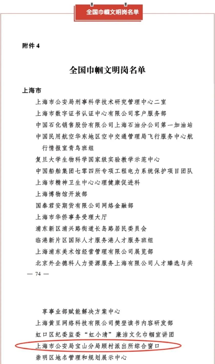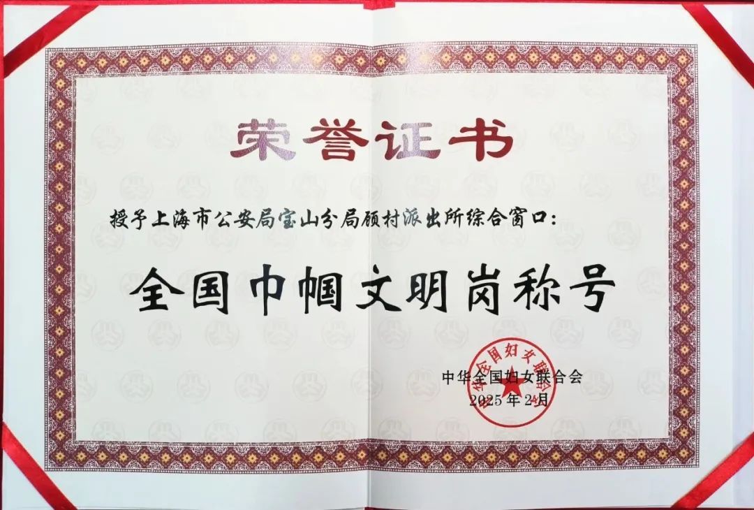 近日,全国妇联在京举行纪念“三八”国际妇女节暨表彰大会。大会表彰了10名全国三八红旗手标兵、596名全国三八红旗手、395个全国三八红旗集体、599个全国巾帼文明岗。宝山区顾村镇顾村派出所综合窗口荣获2024年度全国巾帼文明岗!