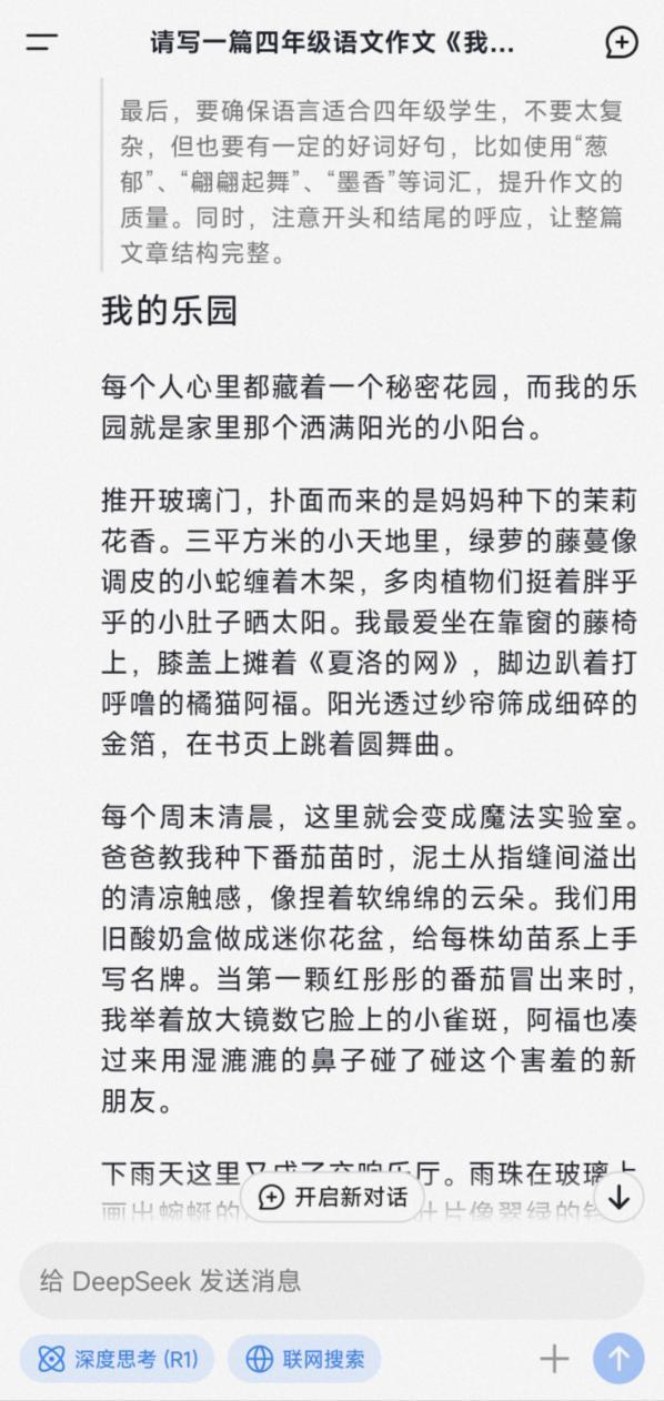 AI软件真能“一键生成”一篇作文?记者打开手机里的DeepSeek,输入四年级作文《我的乐园》,30秒后就生成一篇结构完整、质量不错的范文。此外,DeepSeek还能根据提供的关键词生成不同类型的作文,例如记叙文、说明文等。