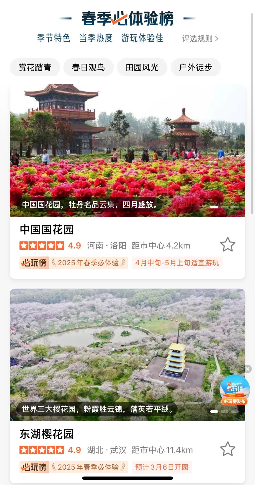 2025年“必玩榜”还首次推出“当季必体验榜”,按季度发榜,在全国范围内为用户甄选“当季特色、热度高、体验佳”的时令游玩地,提供“中国四季必玩指南”。首发春季榜包含赏花踏青、春日观鸟、田园风光、户外徒步四大主题共32个游玩地。