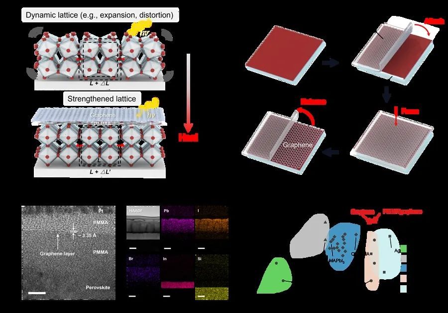 那么,怎么在微观层面上为钙钛矿“强健筋骨”?团队找到了神奇的诺奖级二维材料——石墨烯。论模量,也就是材料抵抗变形能力的物理量,石墨烯具有超高模量,是钙钛矿材料模量的50到100倍,且具有均匀致密、耐机械疲劳和化学稳定的优点。有没有可能借助石墨烯这个“外援”,来提升钙钛矿的稳定性呢?然而,石墨烯与钙钛矿并不兼容,又该如何“稳住”?