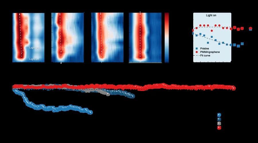 据测算,得益于石墨烯出色的机械性能和聚合物的耦合效应,钙钛矿薄膜的模量和硬度提高了两倍,并显著限制了在光照条件下的晶格动态伸缩效应。石墨烯-聚合物双层结构将晶格变形率从+0.31%降至+0.08%,有效减少了晶界附近由膨胀引起的材料破坏,进而确保钙钛矿器件在光照、高温及真空条件等环境下的长期稳定性。