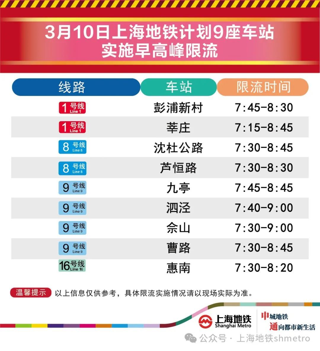 3月10日早高峰曹路、惠南等9座地铁站计划限流