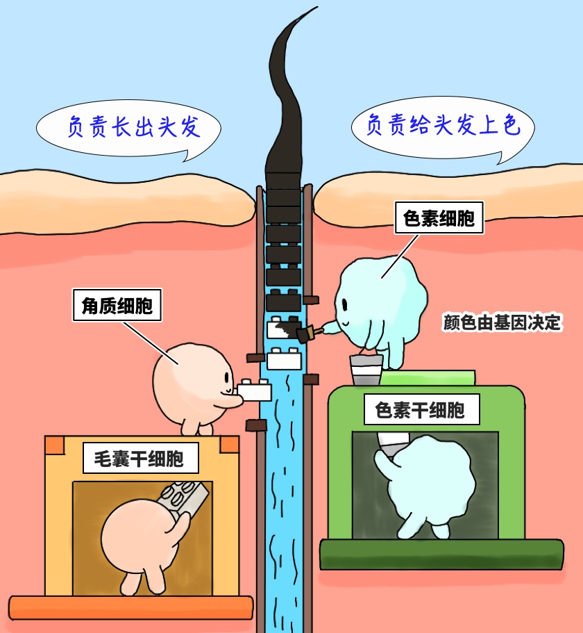 头发黑不黑,跟头发里的黑色素细胞(简称黑素细胞)有直接的关系。黑素干细胞总量减少,或黑素细胞功能异常,产生黑色素变少,没了黑素细胞上色,头发就会变白。