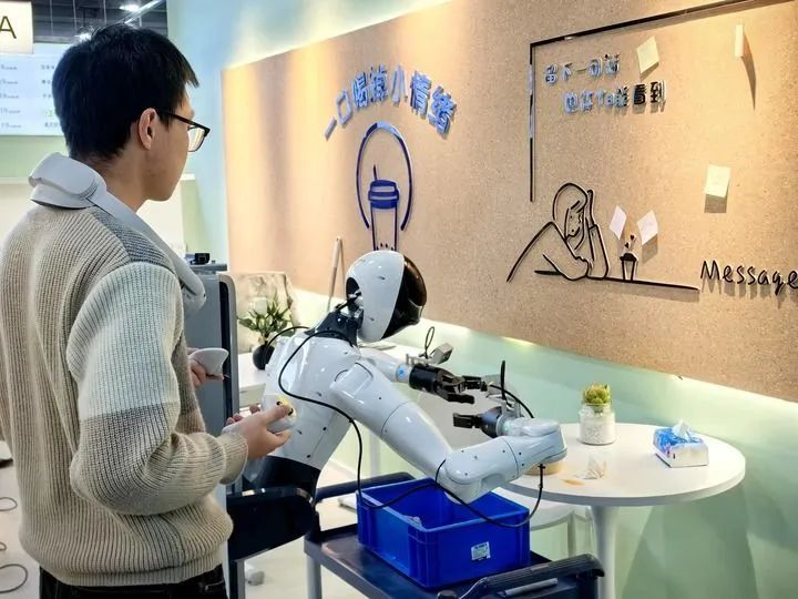 在数据采集员操作手柄的指挥下,一排排机器人学习各种技能:端茶倒水,熨衣服,用吸尘器清扫地面,整理超市货架;在滨江步道,机器人迈开腿脚跑步,不仅稳当还能灵活避开行人;在医院诊室,外骨骼机器人帮助偏瘫的老人重新站立行走……未来已来。随着人工智能和大模型的迭代赋能,机器人不仅具备了更灵巧的身体,还武装了更聪明的大脑。人形机器人加速跑向量产元年,或许在不久的将来,花5万元买一台人形机器人帮你做家务,将不再是幻想。走进上海首座人形机器人量产工厂——智元新创技术有限公司一期工厂,一台台机器人正被有序组装、调试、下线,年产能达数千台,订单还在不断增长。在4000平方米的智元机器人数据采集中心,搭建的餐厅、奶茶店、家居等日常生活场景中,上百名数据采集员头戴VR眼镜、手持操作手柄,“手把手”教机器人做家务——叠衣服、收拾碗筷、倒茶、送餐、清理桌子、超市收银……