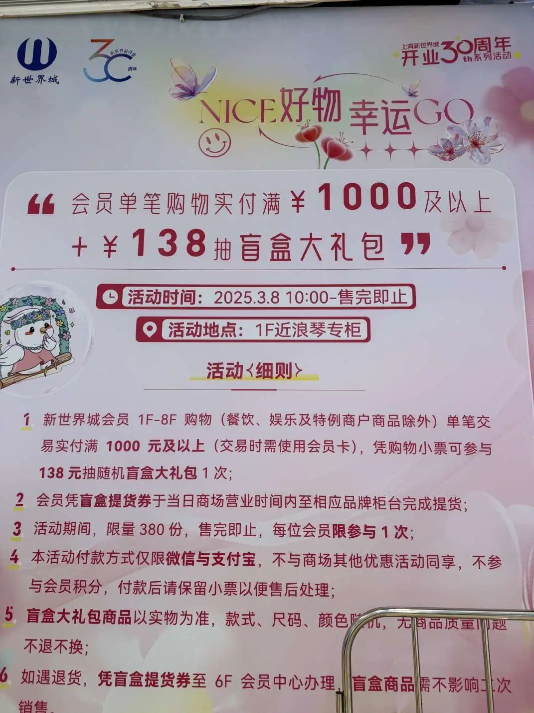 3月8日节日当天,更是惊喜连连。上午10点,“女神专享神券”将在新世界城户外广场限量发售:前200名女性会员享138元团500元,后800名享380元团500元;38节当日会员单笔购物实付满 1380元及以上,还可获赠100元无门槛会员电子购物券,限量1380份;微信小程序上线38积分加38元即可兑换100元黄金珠宝券,限量1000份,每人限购2份。