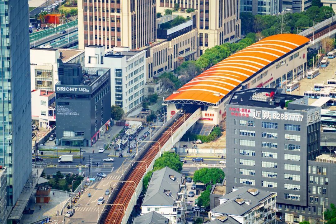 从高空俯瞰,曹杨路地铁站清晰可见,每隔几分钟,地铁列车穿梭而过,为这幅画卷增添了一份动态的活力。