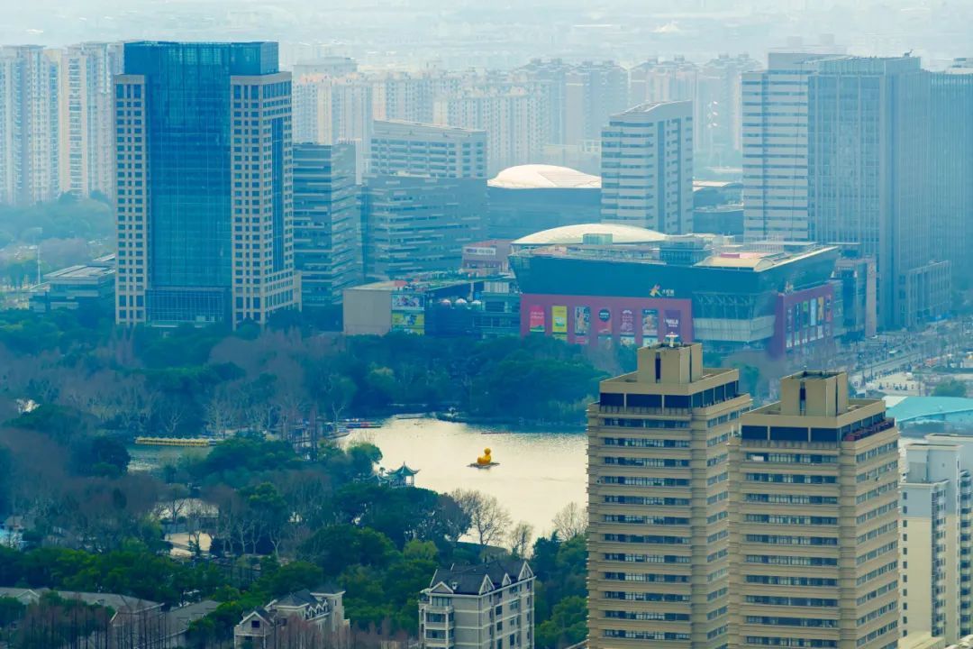 远眺还能看到长风公园的银锄湖,在夕阳映照下,湖面泛起层层金色波光,熠熠生辉。湖面上,那只标志性的小鸭子静静漂浮,为画面增添了一抹灵动。