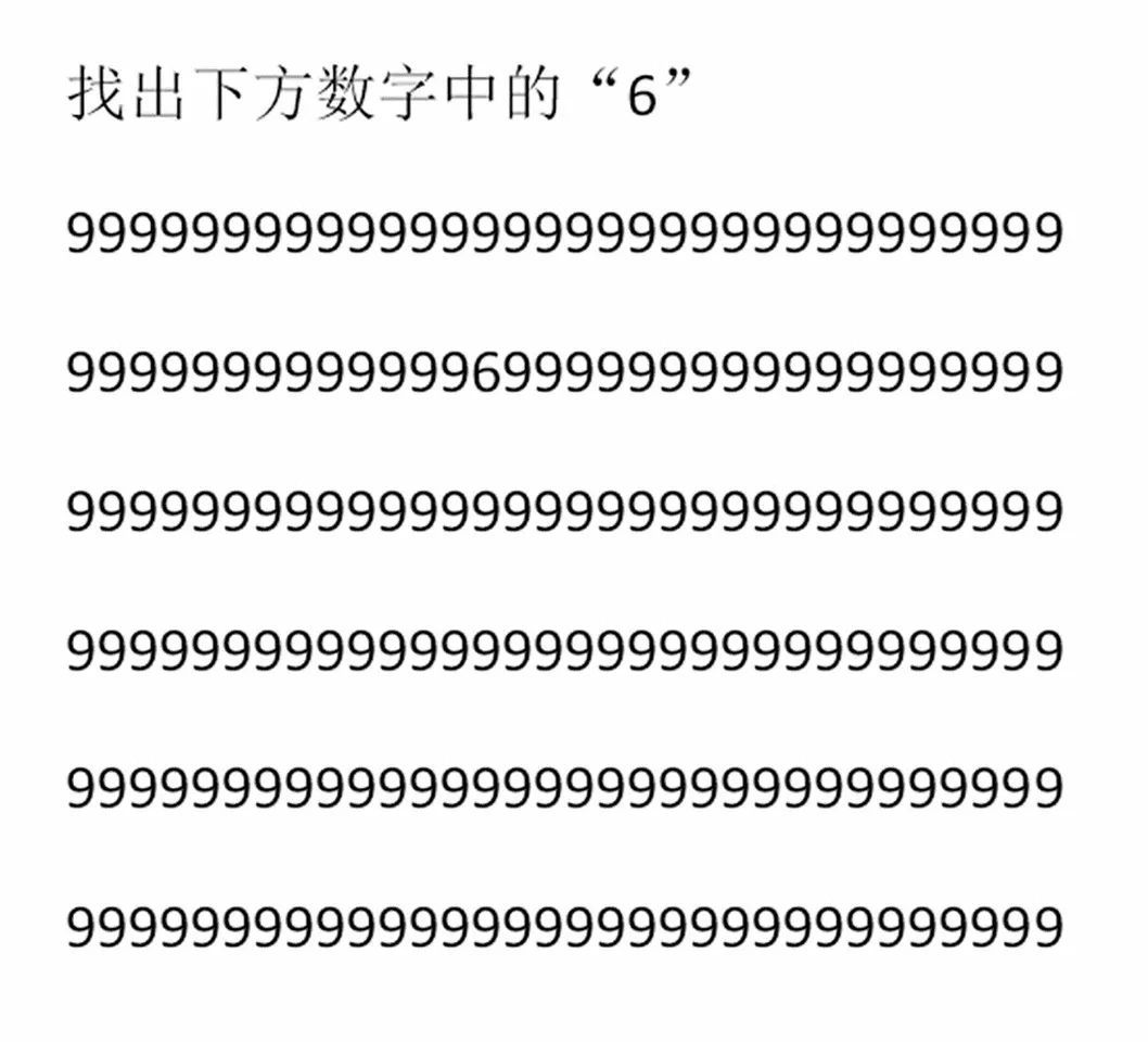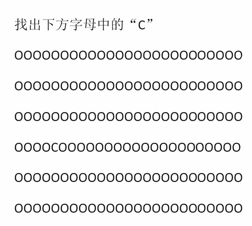 按顺序分别找出字母“N”、数字“6”、字母“C”。这个测试主要是检查视空间感,若存在障碍,就不会发现不同。