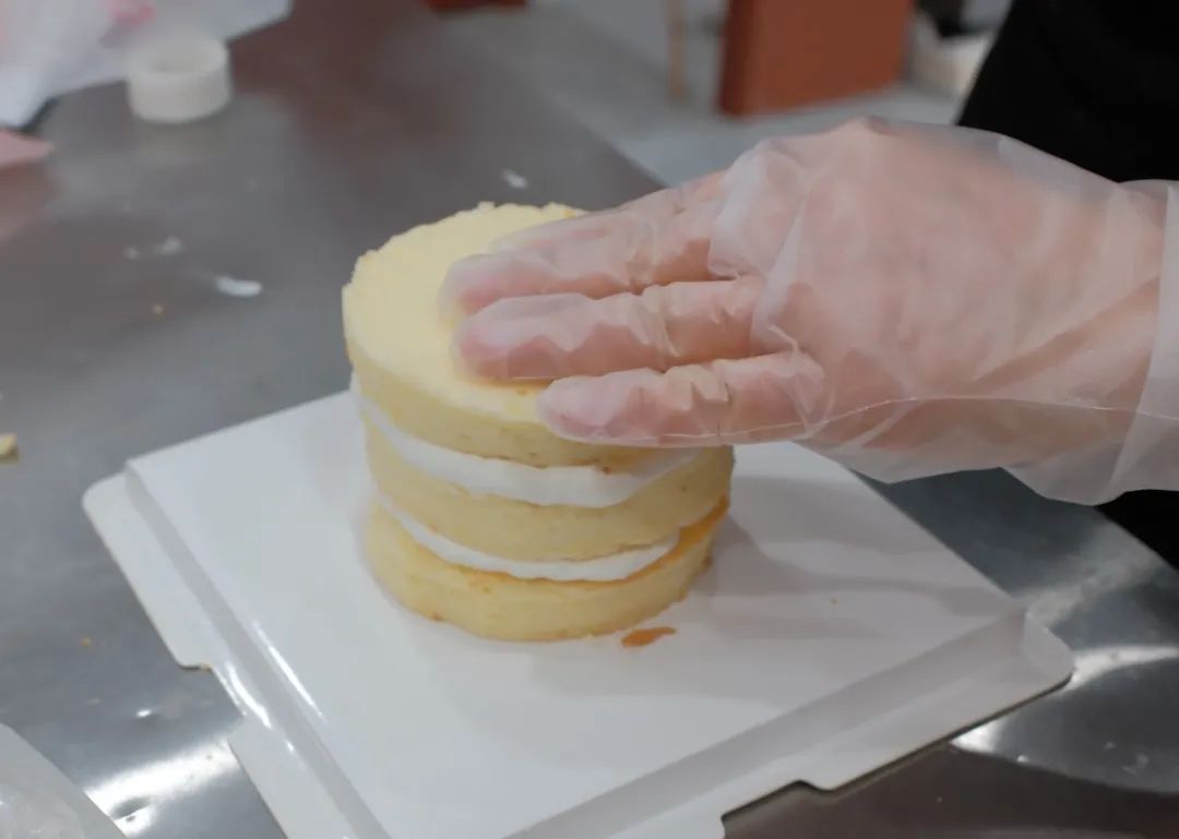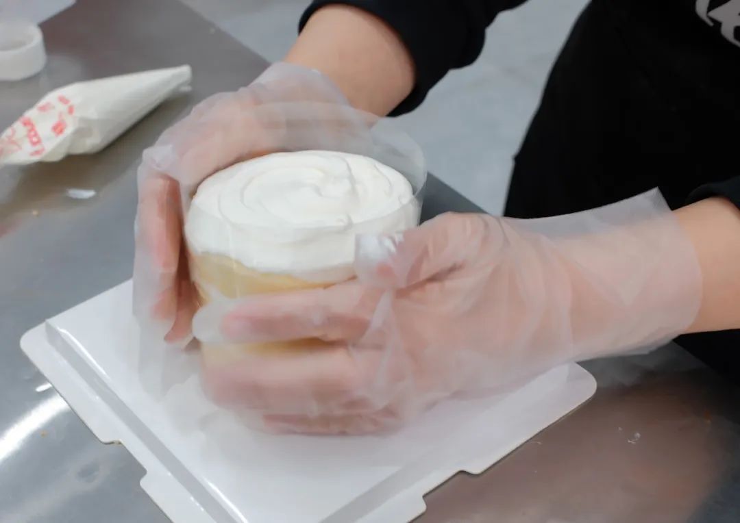 在一片蛋糕上抹一层打发好的奶油,再盖上一层蛋糕片,重复此步骤,直到三层蛋糕全部组装好。在最上层蛋糕胚上抹一层薄薄的奶油,用抹刀将蛋糕表面抹平。将蛋糕外围包上围边。