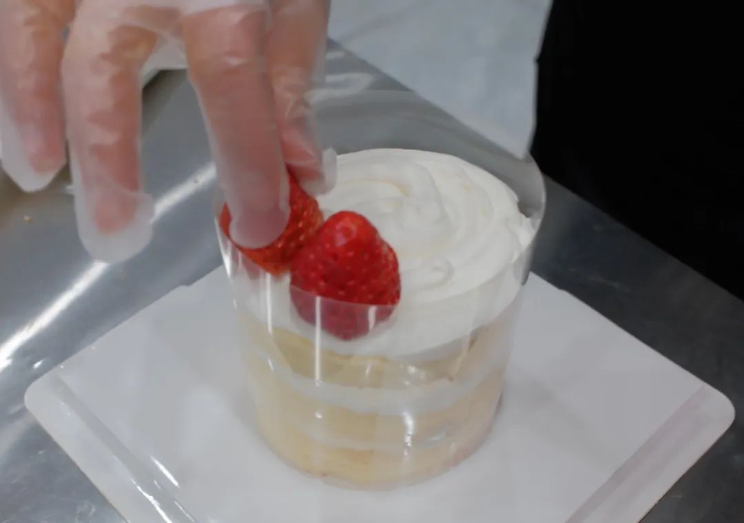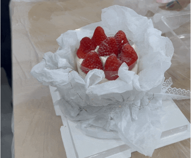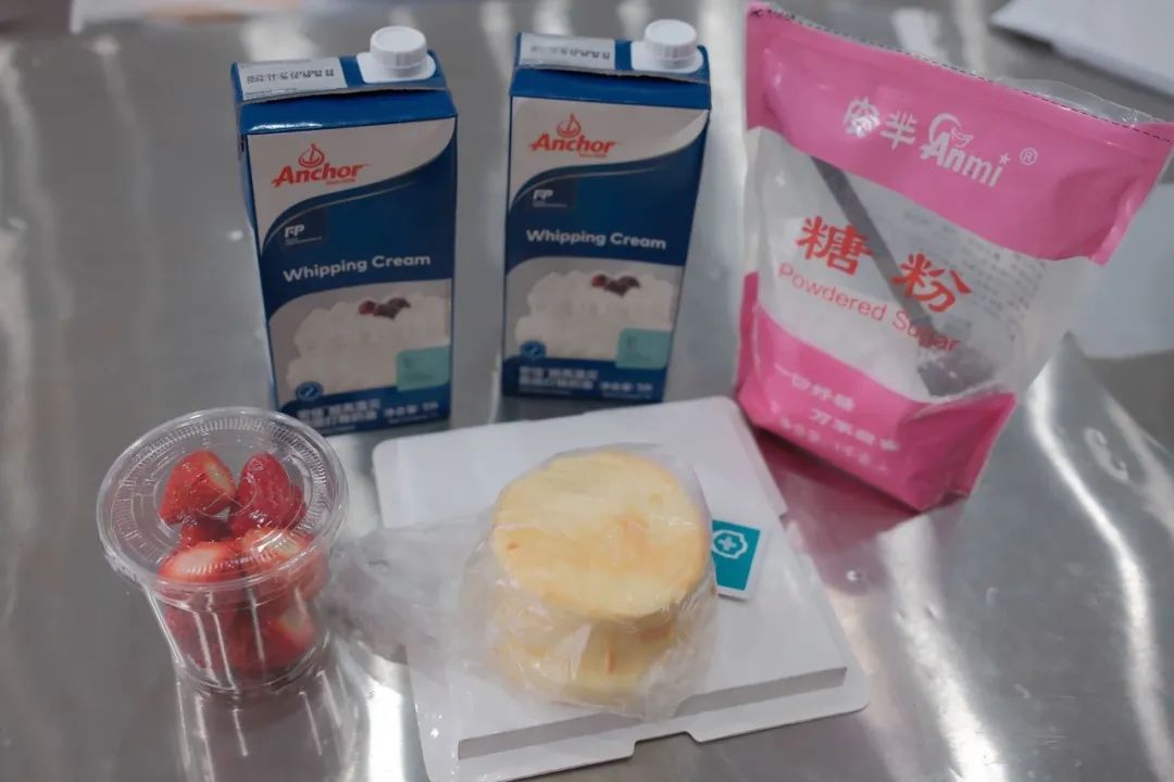 蛋糕胚、奶油、草莓、糖粉、雪梨纸、丝带、灯带、蛋糕透明围边