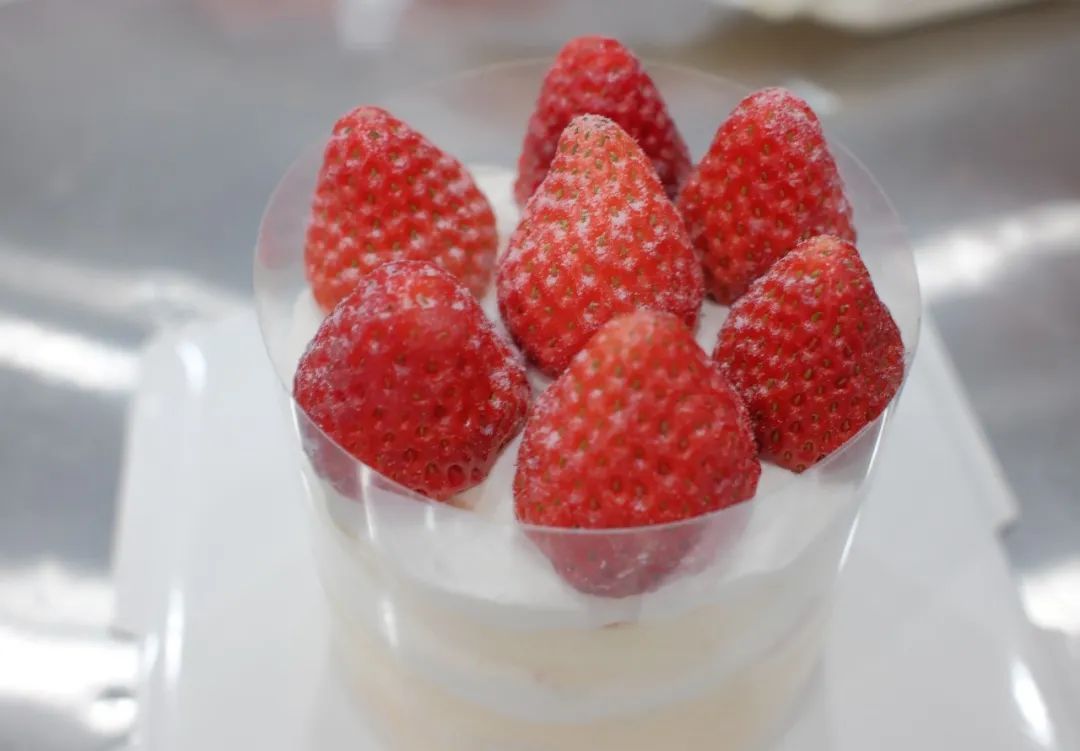 将草莓摆放至蛋糕最上层,尽量紧凑,撒上糖粉装饰。