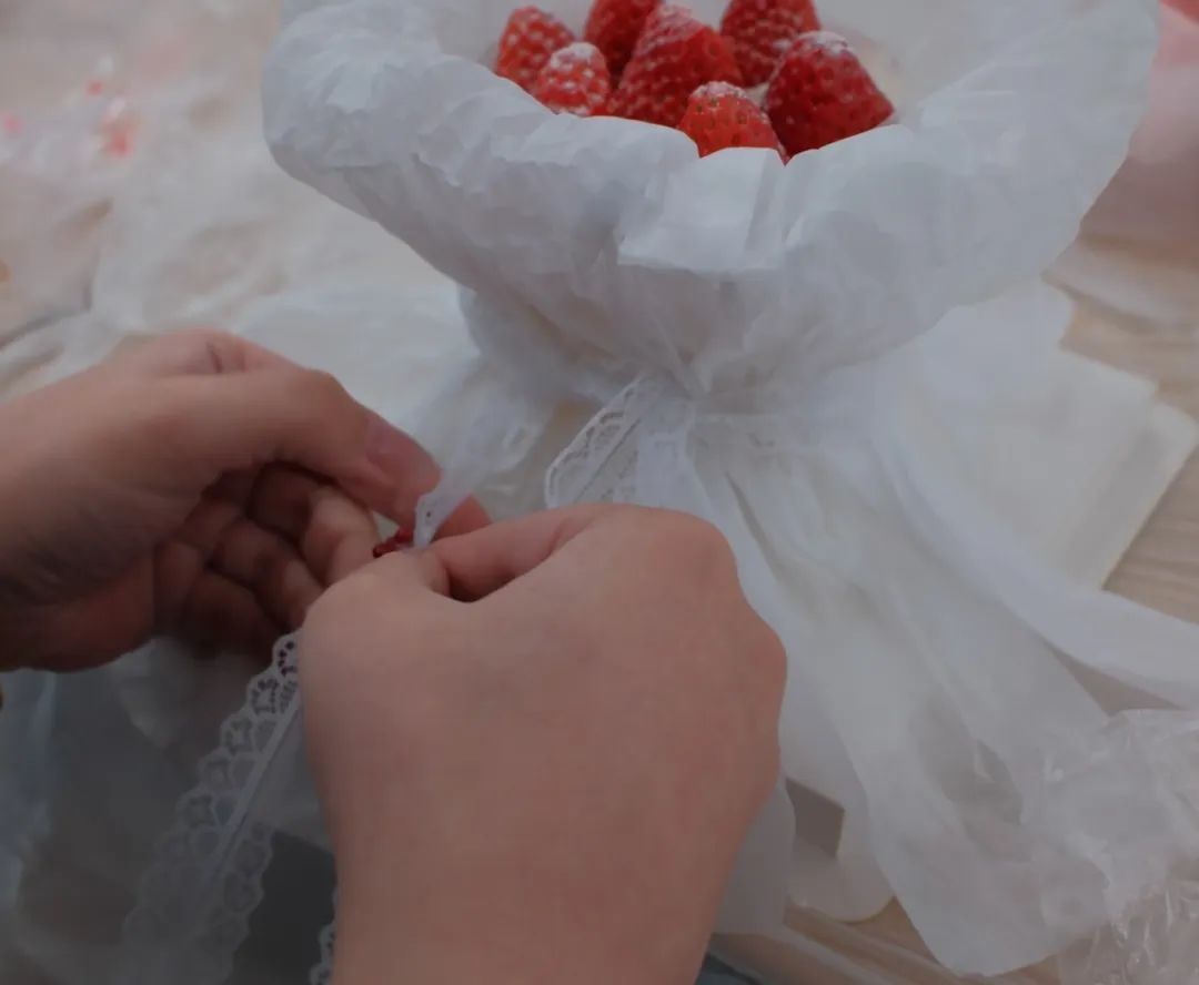 将雪梨纸揉捏,揉皱后贴在围边上,形成层次感。最后用丝带系在雪梨纸上,打一个漂亮的蝴蝶结,围上灯带。