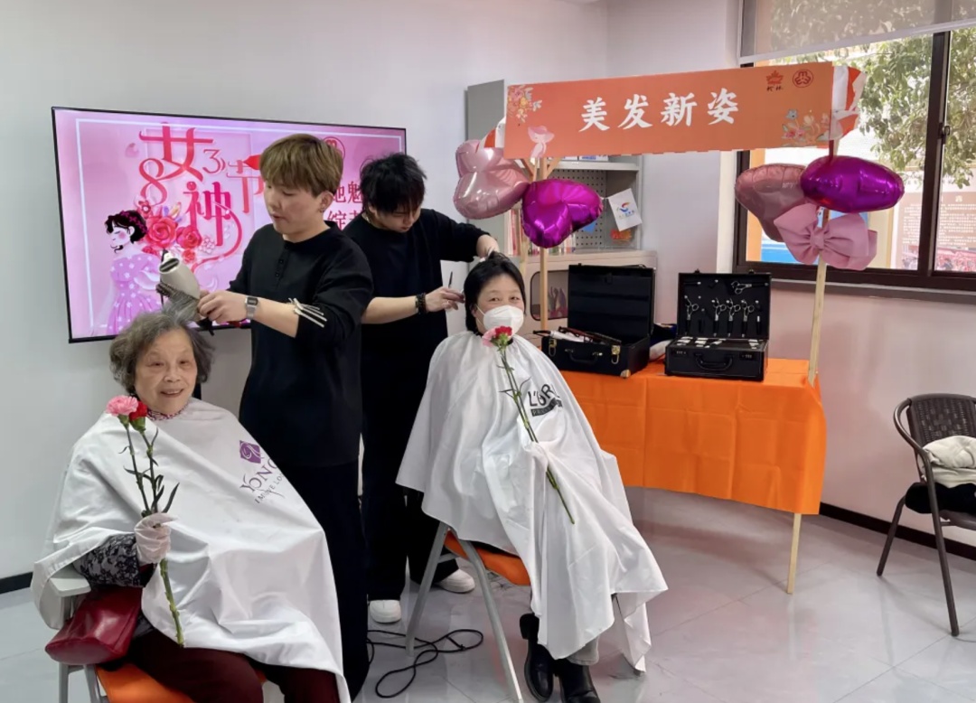 室外的“眉韵雕琢”区,志愿者小桑为女士们量身修饰眉形;室内的“美发新姿”区域,永琪理发师们用娴熟的手艺为女士们剪出一个个时尚而又不失个性的发型。