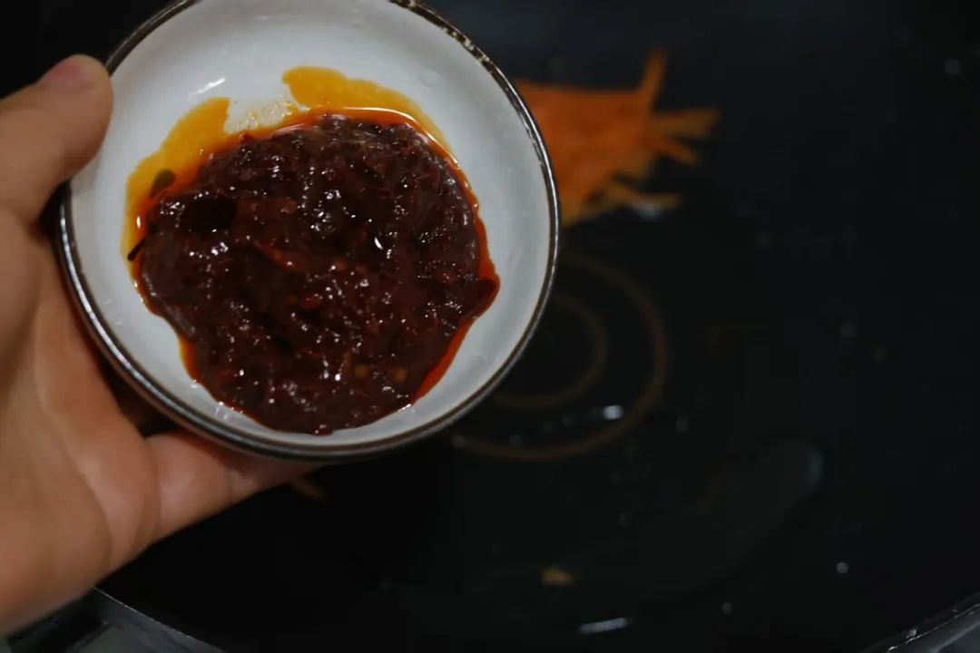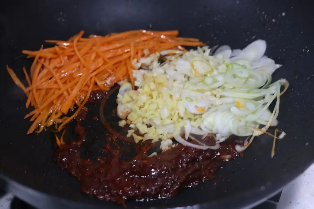 4.倒入30克食用油,加入胡萝卜丝煸炒,倒入豆瓣酱,翻炒。