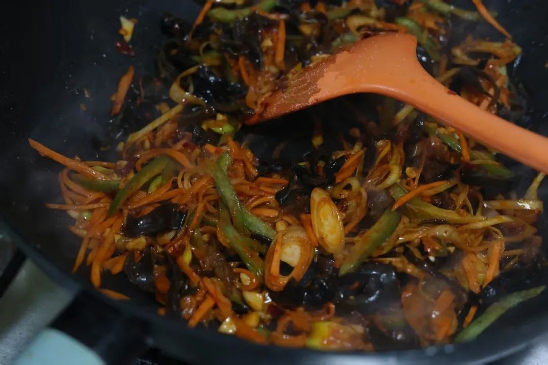 6.加入青椒木耳丝、肉丝翻炒,最后倒入调好的酱汁。