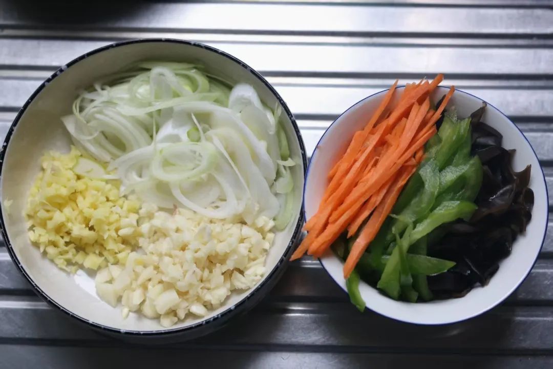 食材:瘦肉300克、黑木耳40克、胡萝卜30克、豆瓣酱30克、食用油60克、青椒50克、大葱20克、大蒜6瓣、醋30克、生抽20克、姜20克、生粉10克、清水60克、盐2克、白胡椒粉1.5克、蛋清30克