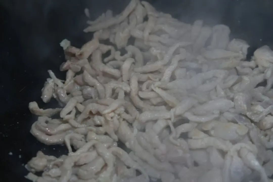 3.锅中倒油30克,肉丝煸炒熟盛出。