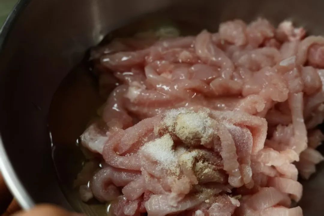 1.瘦肉切丝,加白胡椒粉、盐、料酒、蛋清腌制15分钟。