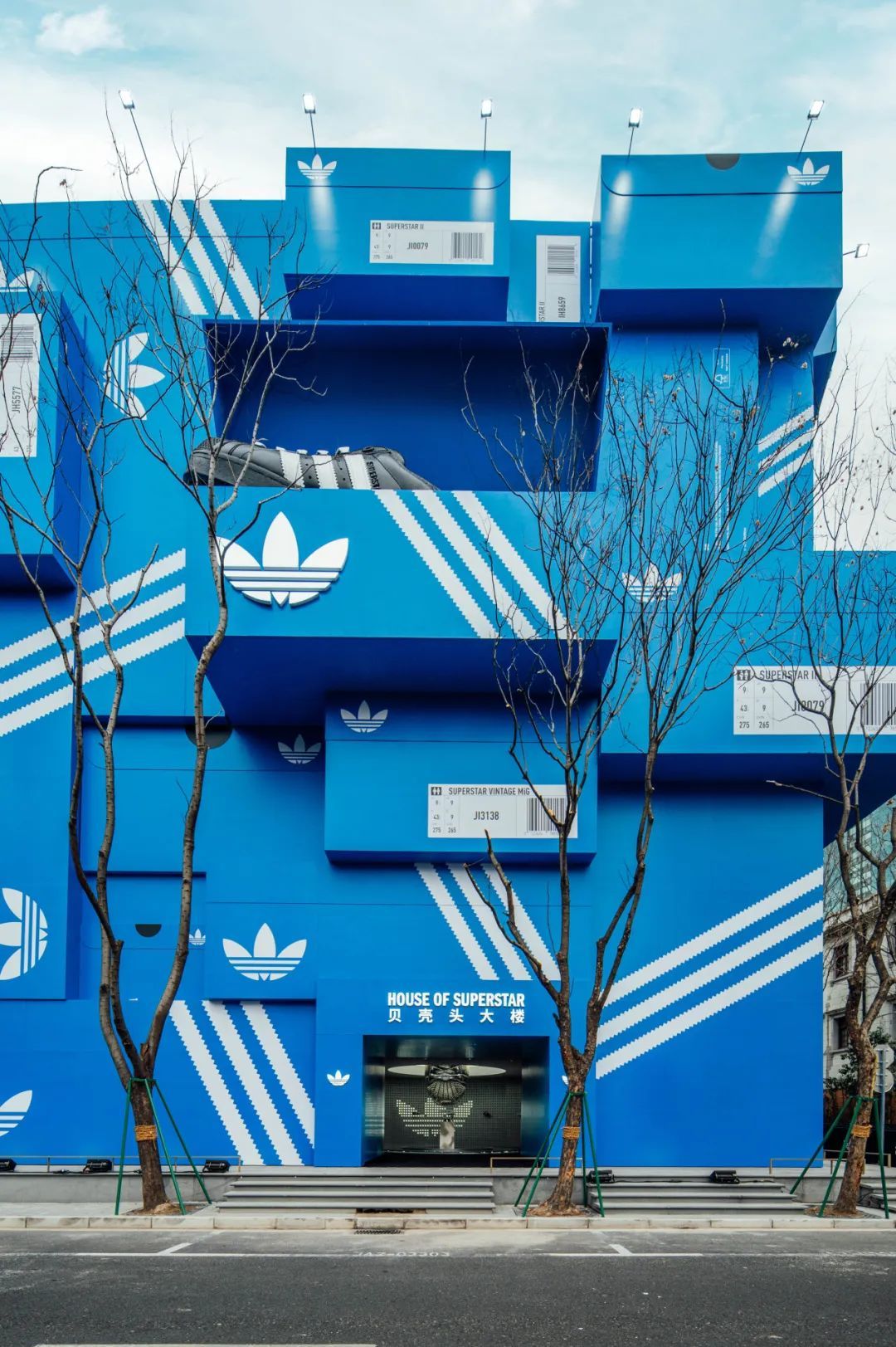 现场的巨型蓝色“鞋盒”即“贝壳头大楼”品牌展区,展示本次企划的主推Superstar II鞋型。同时,三叶草打造贝壳头档案室,展示百双来自不同时期、不同版本的Superstar鞋款,让观众近距离了解贝壳头的经典历史与时代传承。