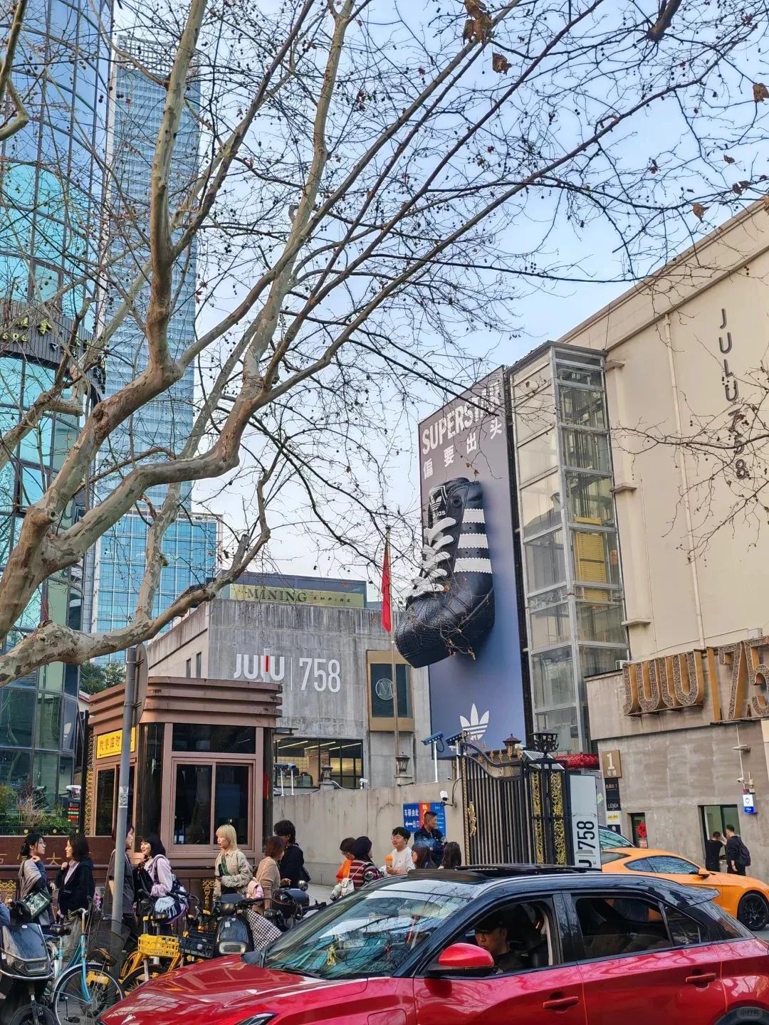 除了永源路,品牌还在静安巨鹿路758号也投放了巨型广告牌和贝壳头鞋装置,吸睛的“出头”造型和“偏要出头”的slogan,同样成为热门打卡点。