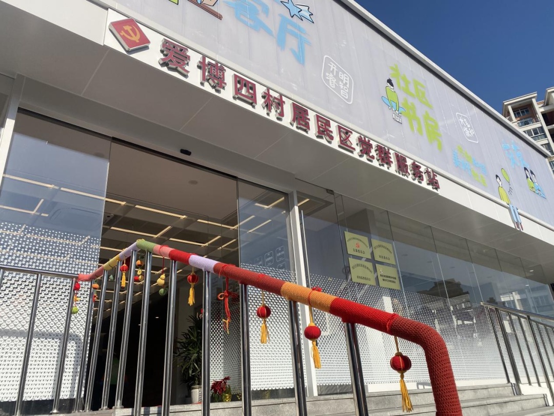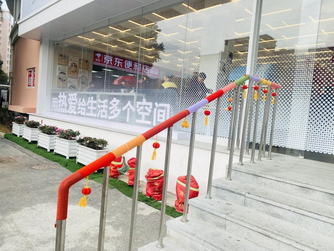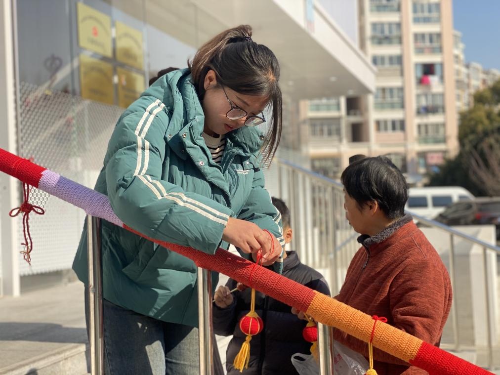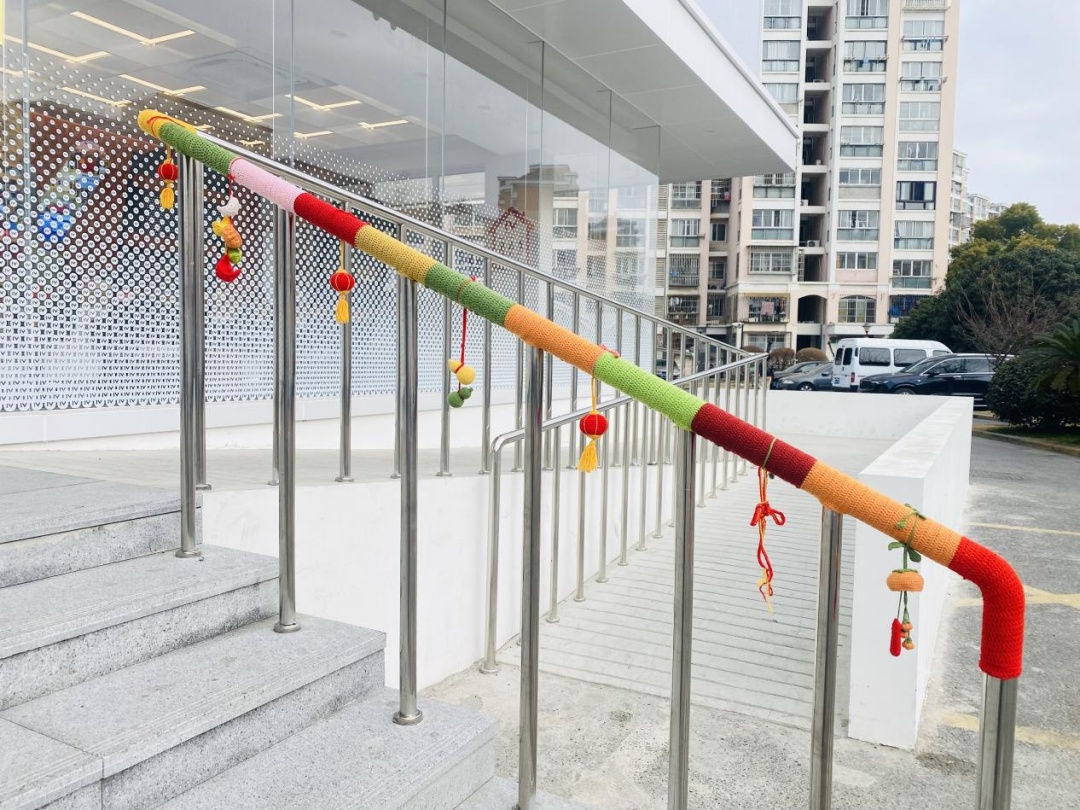 早春三月,来到新虹街道的爱博四村党群服务站,居民们发现原本光秃秃的不锈钢扶手披上了“霓裳羽衣”,毛线织就的春意来到了居民们身边。