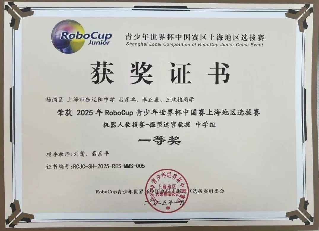 吕彦卓、李正康、王耿植荣获2025RoboCup青少年世界杯上海赛区“微型迷宫救援初中组”一等奖