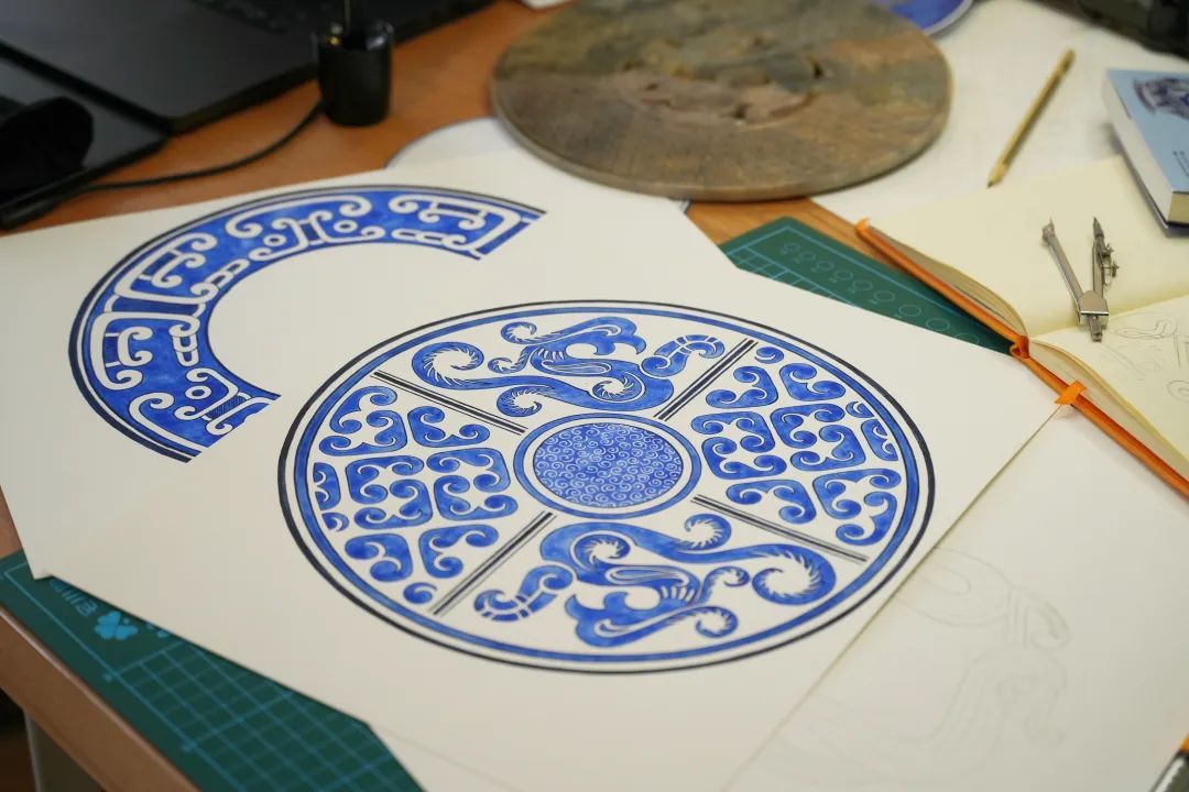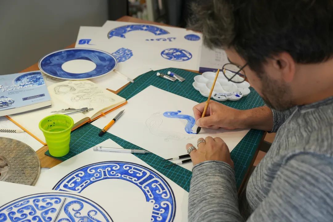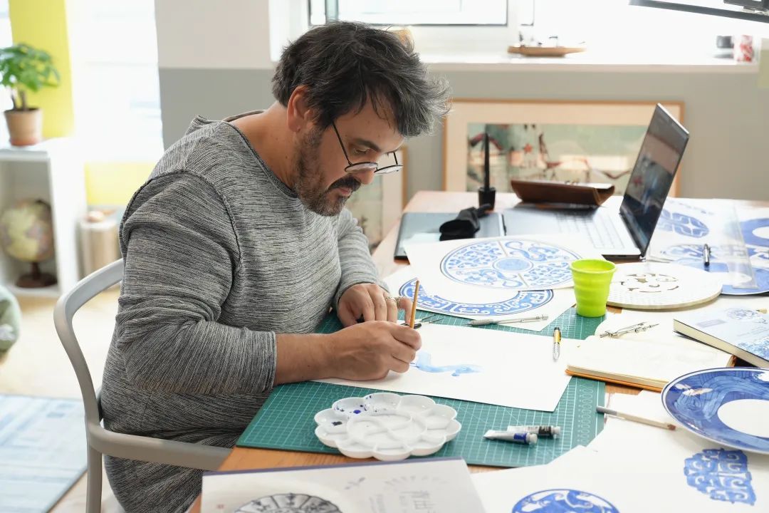 步入Hervé的工作室,里面摆放着各种有关青花瓷的书籍和样式图。他深谙,作为一位拥有法国艺术背景的艺术家,在中国要想取得创新突破,必须将自身文化与中华传统文化相融合。Hervé表示:“在法国的学习经历为我打下了坚实的艺术根基,而来到中国后,我致力于让这两种文化在我的作品中碰撞交流,展开一场跨文化的对话。”