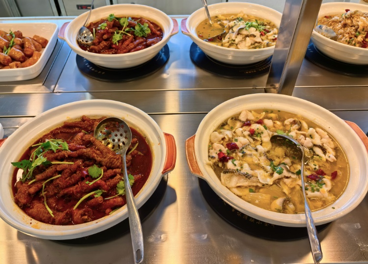 中午时分,食堂迎来用餐高峰。自助餐台上不仅整齐摆放着蒜蓉娃娃菜、拌猪耳、酸汤鱼等荤素菜品,还提供各式糕点小吃和应季水果,白领和居民们端着餐盘有序排队,按需夹取。“称重模式能多尝几样菜,看到喜欢的都能挑一筷子。”现场,大部分顾客的餐盘内都夹了不下5种菜,结账时价格在30元左右。“筷简单”经理刘坛华介绍称,菜品每三天更新一次,并根据顾客反馈及时调整咸辣口味,“辣的菜下饭,但现在尽量少做,要更符合大家口味和健康需求。”