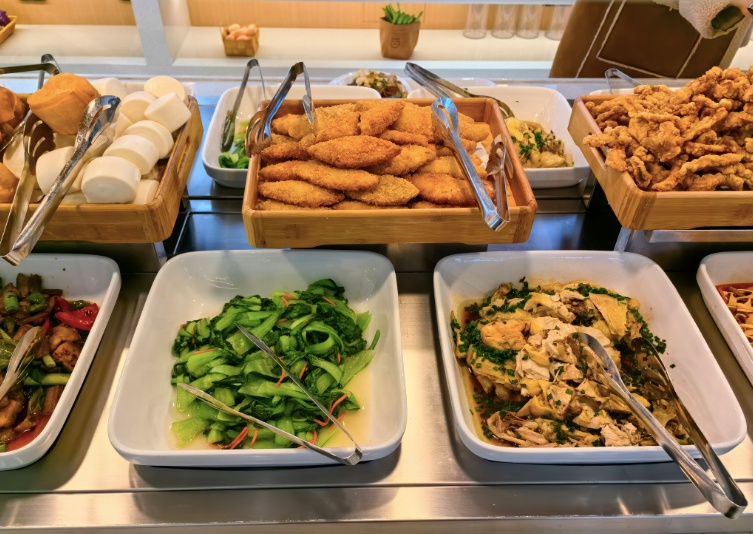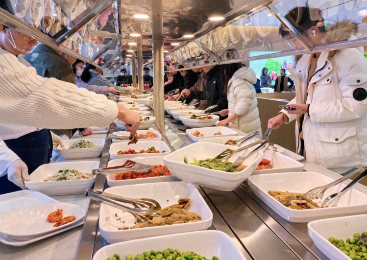 自助餐台上热气腾腾,顾客有序排队挑选心仪菜品