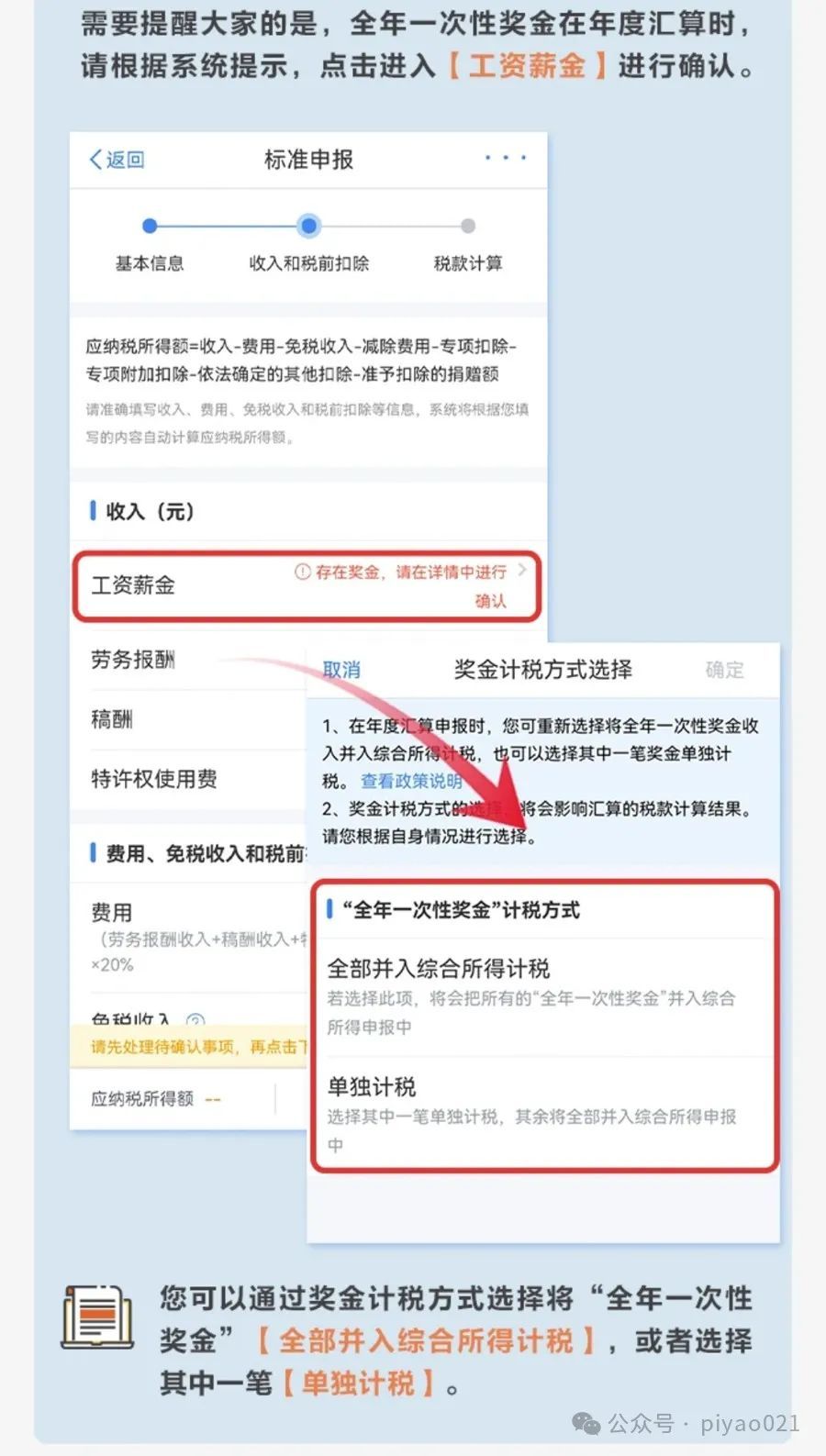 例如,对于年终奖等一次性奖金,是“全部并入综合所得计税”,还是“单独计税”,汇算的结果可能完全不同,有时可能从“退税”变成“补税”,也可能从“补税”变成“退税”,或者同样是“退税”“补税”,但金额不同。申请人可以不同计税方式都汇算一下,然后选择适合自己的方式。