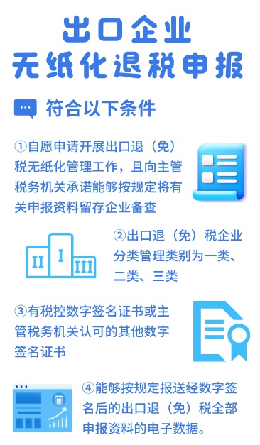 答:根据相关文件规定,符合以下条件的出口企业,可向税务机关申请无纸化退税申报:①自愿申请开展出口退(免)税无纸化管理工作,且向主管税务机关承诺能够按规定将有关申报资料留存企业备查;②出口退(免)税企业分类管理类别为一类、二类、三类;③有税控数字签名证书或主管税务机关认可的其他数字签名证书;④能够按规定报送经数字签名后的出口退(免)税全部申报资料的电子数据。