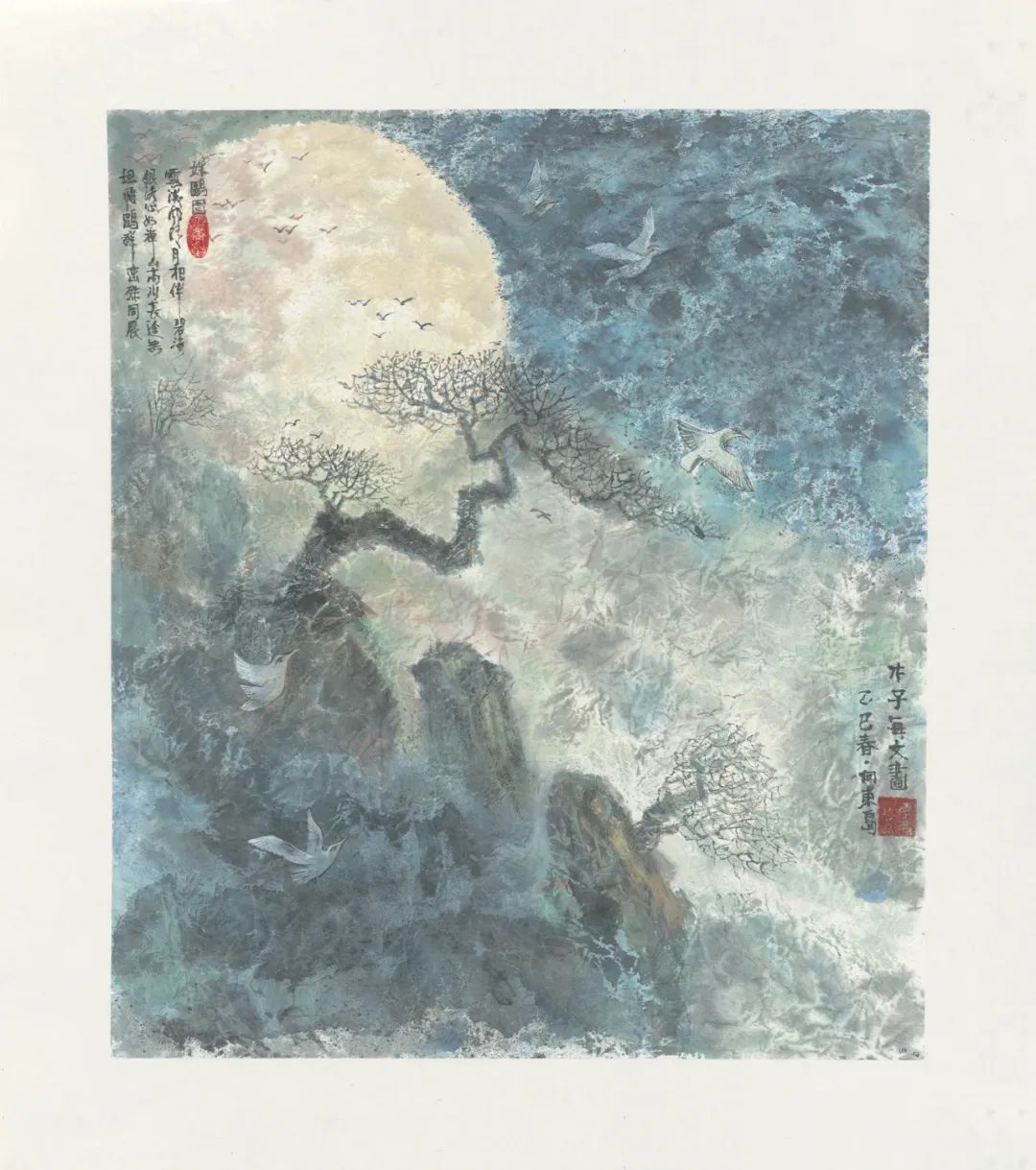 上海美术学院教授、展览策展人李敏,从小受启蒙老师、享受国务院终身特殊津贴的艺术家杨明贵先生影响,热爱艺术。她的作品《姝鸥图》以月清风高的寓意展现艺术家的心格,并配以诗歌:“云谈风清月相伴,碧海银涛心如禅;山高水长途无坦,飞鸥群峦殊同展。”李敏介绍:“我希望通过诗词传达创作的意境、心境和理想,并且我也在尝试与AI对话,共同追求人机协塑艺术之美。”