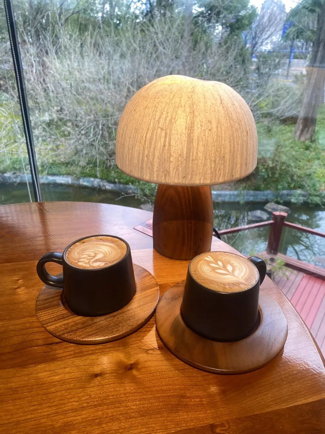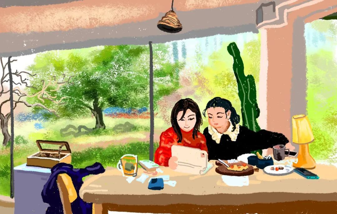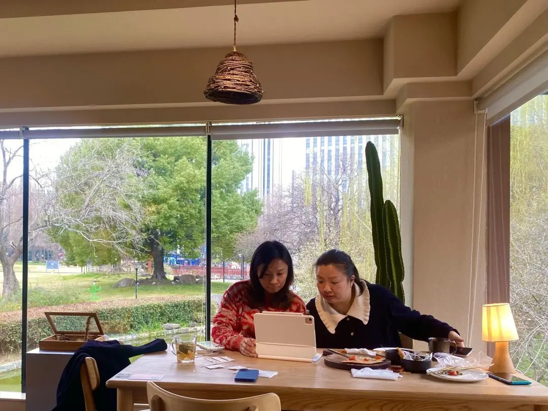 咖啡馆的大玻璃窗外是公园的小溪草坪和蜿蜒的老树,小姐姐们选择的位置风景独好。