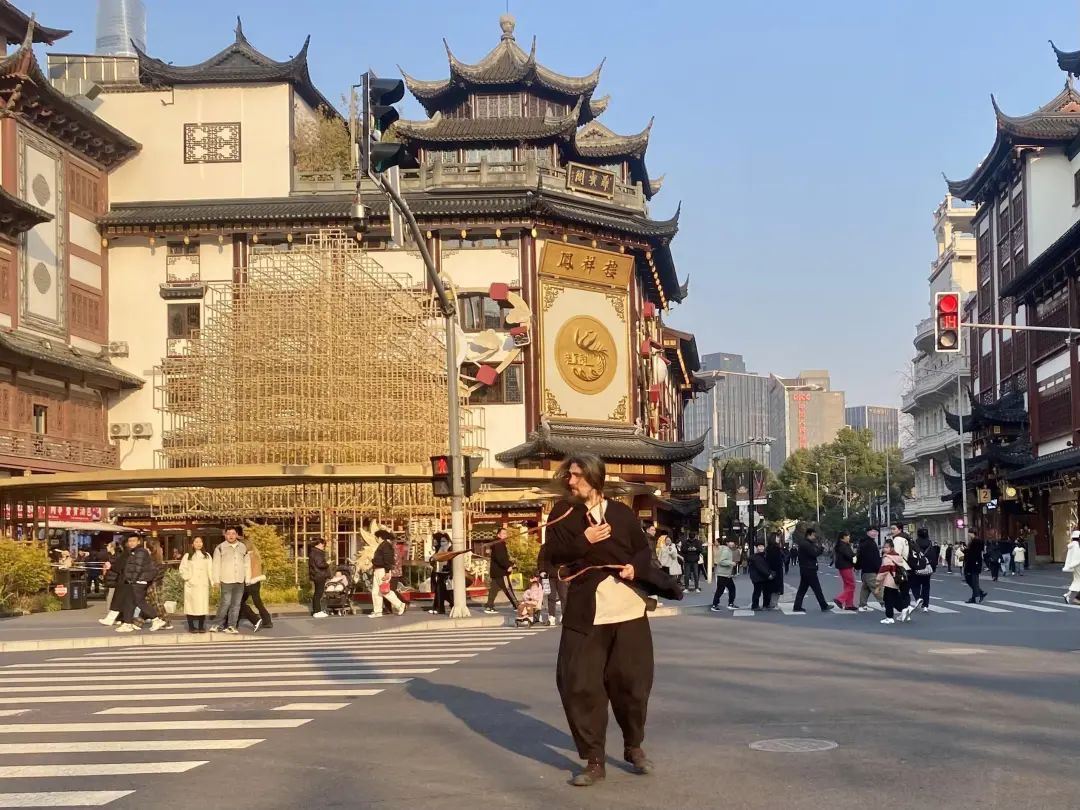 豫园周边游客渐多,慕名而来的洋网红在古色古香的建筑群里演绎对中国功夫的热爱。