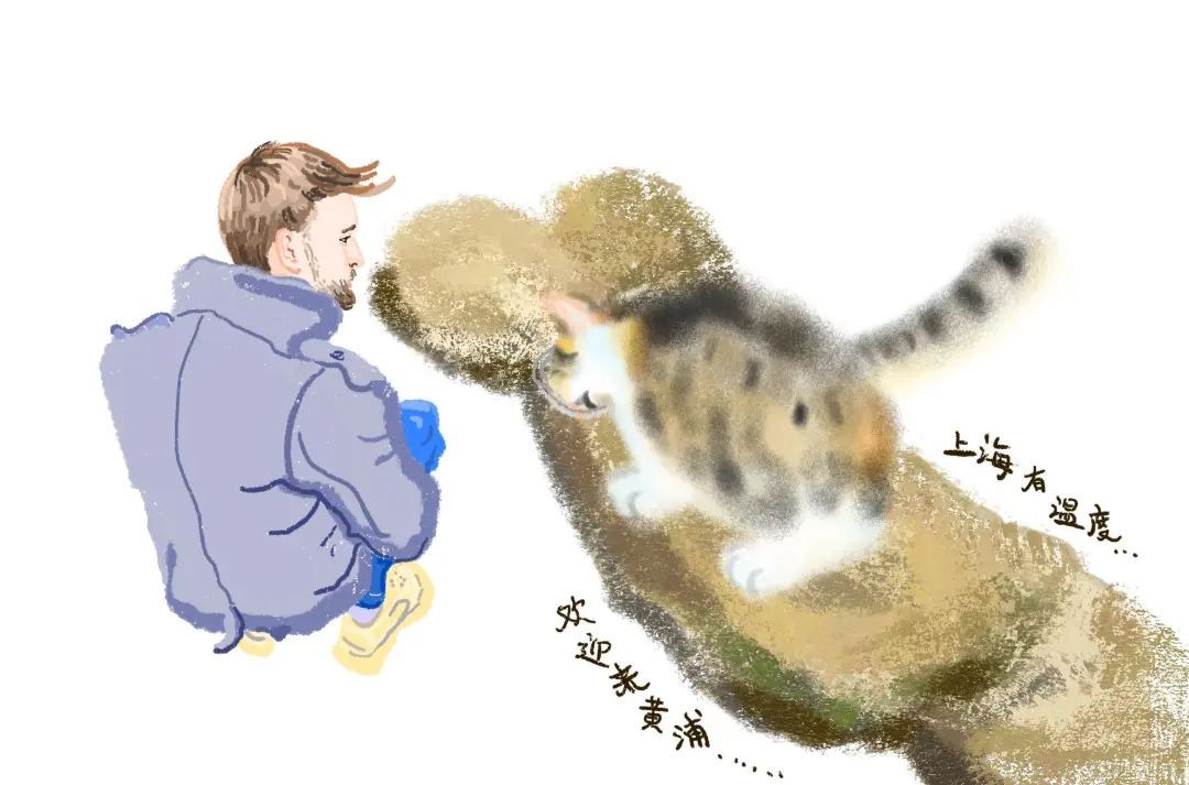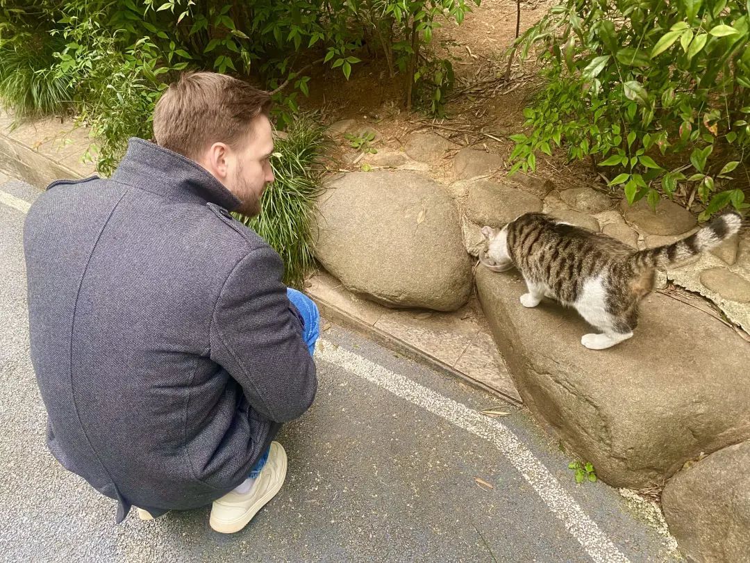 路过古城公园的外国小年轻,俯身和悠闲被投喂的喵星人们握手说“你好”。上海让远道而来的人们感受到了这座城市的温度。