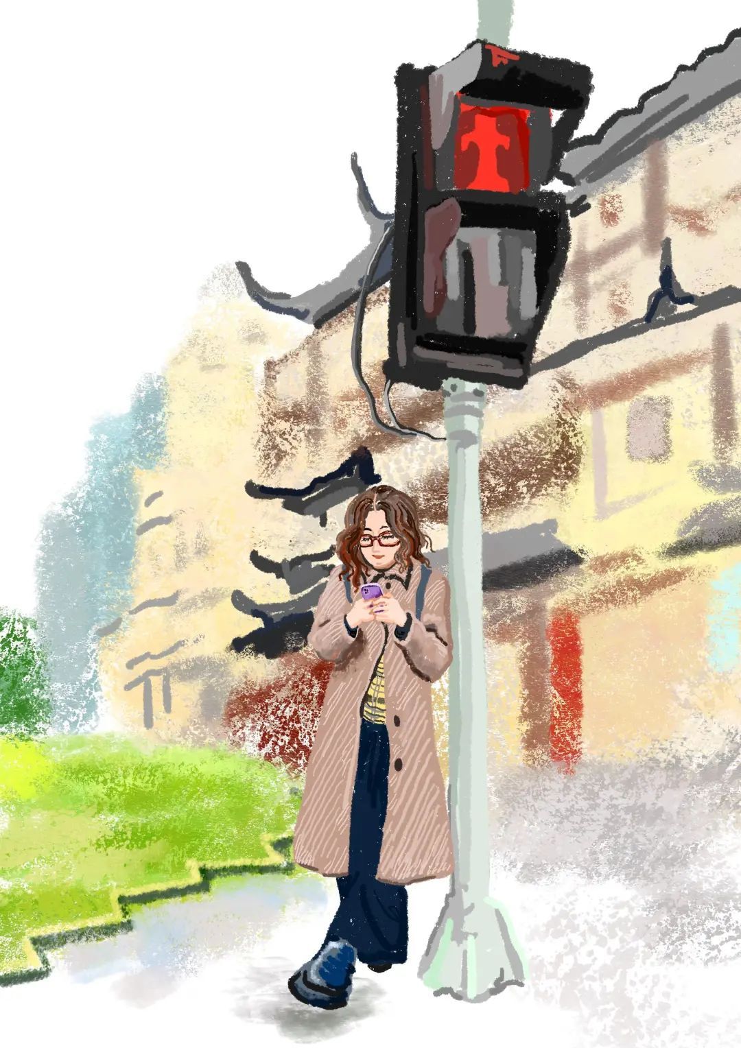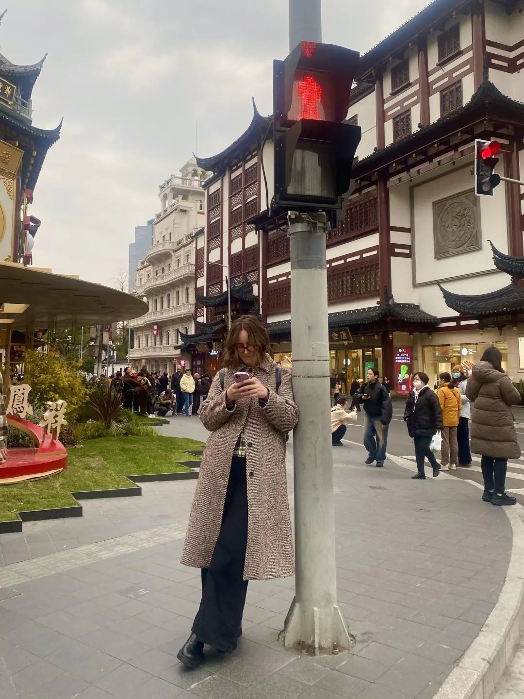 倚在红绿灯下,等候朋友的书卷气外国女生,别说和背后的中式建筑还挺搭。