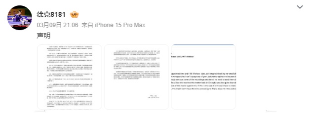 3月9日,因涉嫌性骚扰被禁赛10年的乒乓球教练徐克发布声明,称之前的裁决严重颠倒事实。声明称:2020年12月31日跨年活动聚会期间,美国队员主动提出希望本人担任其教练并询问薪资问题,且咨询我的个人情感问题,均被本人婉拒。美国队员随后在语音电话中说就住在我斜对面10米内的房间邀请我继续探讨,我敲门进入短暂停留后返回自己房间(全程不到1分钟)。此前,国际乒联(ITTF)在发布的裁决文件中,明确指控教练兼前运动员徐克违反了国际乒联的反骚扰政策,并对其处以禁赛10年的处罚。中国女子在斯里兰卡火车上探身坠落