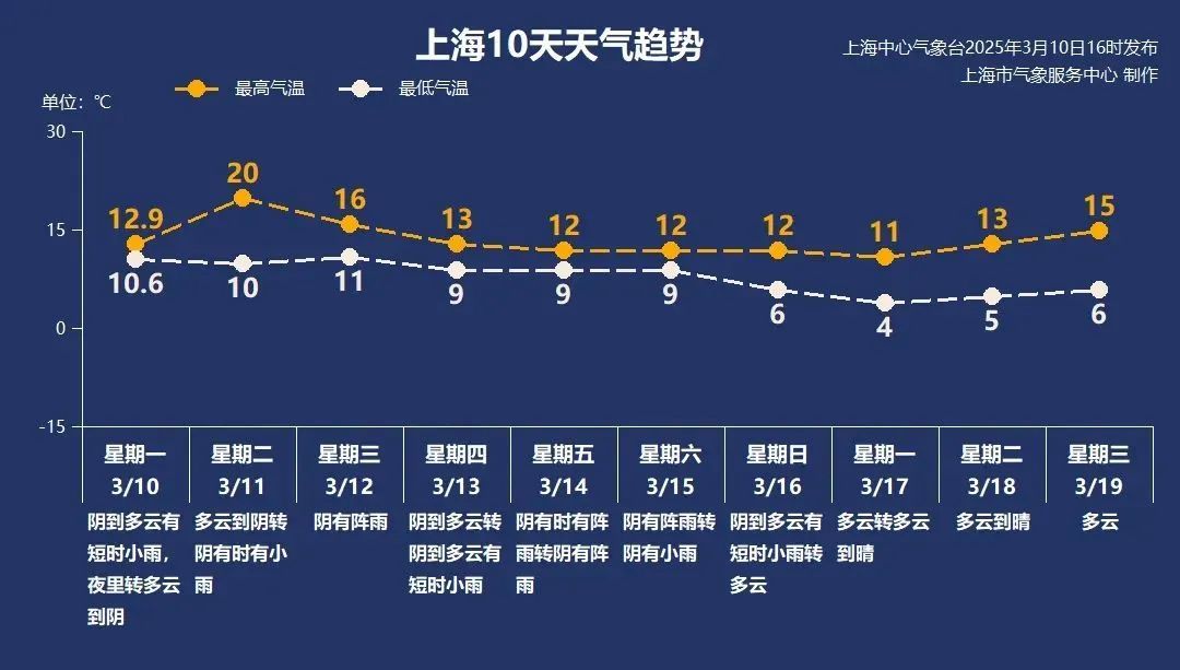 【阴雨持续】明天(3月12日)最高气温降至16℃后,周后期的气温多保持在6℃-13℃之间。在冷暖空气的共同影响下,上海阴雨的天气将会持续至本周末。