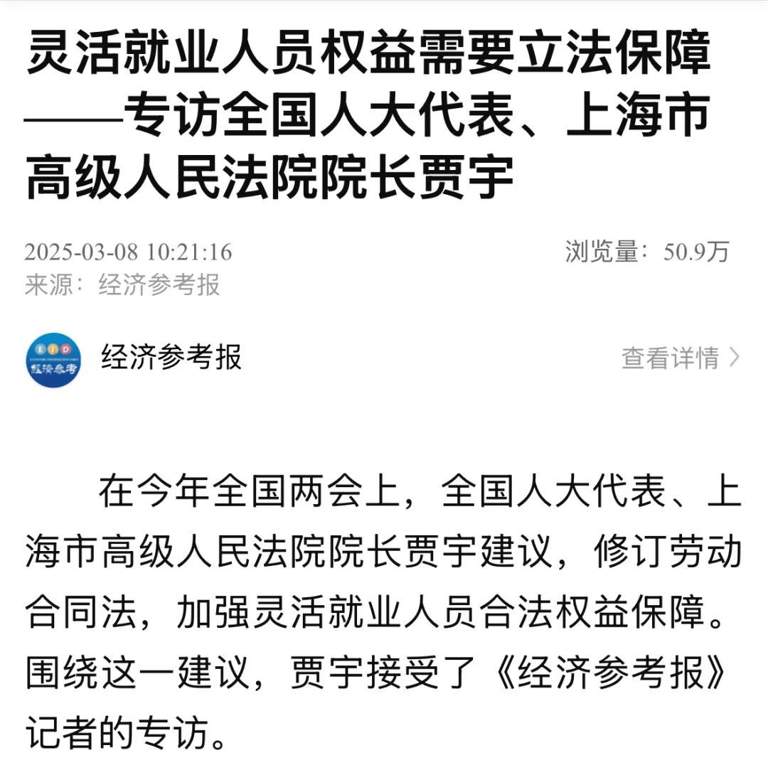 在今年全国两会上,全国人大代表、上海市高级人民法院院长贾宇建议,修订劳动合同法,加强灵活就业人员合法权益保障。围绕这一建议,贾宇接受了《经济参考报》记者的专访。