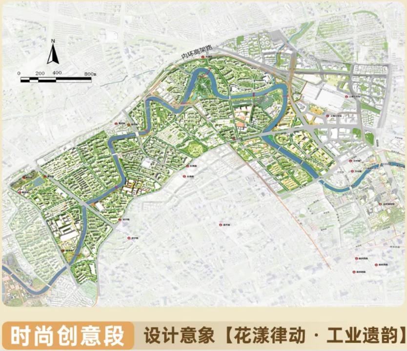 时尚创意段范围在昌平路桥—曹杨路桥,这一段民族工业遗产丰富、红色文化记忆富集,规划通过整合利用存量资源,融合创新文化和特色公共服务,强化河湾两岸功能和活动联动,集中凸显工业遗存和红色遗迹。