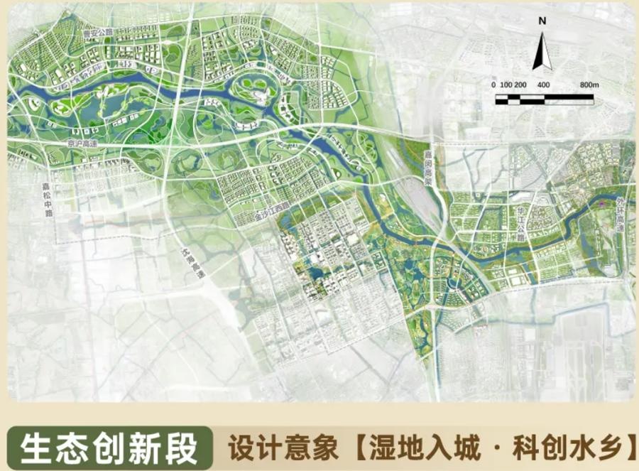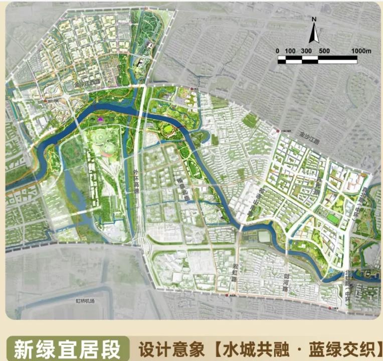 新绿宜居段范围在真北路桥—外环吴淞江桥,规划通过引导腹地成片转型地区内城市功能和绿色开放空间相融,协调外环两侧四区交界节点空间,集中打造文体娱融合的大型滨水节点。