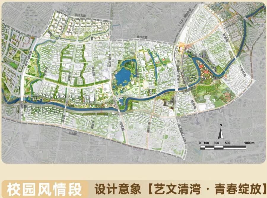 校园风情段范围在曹杨路桥—真北路桥,规划加强华东政法大学等高校校园和城市开放融合,突出知性、青春、活力、奔放的滨水区特色。