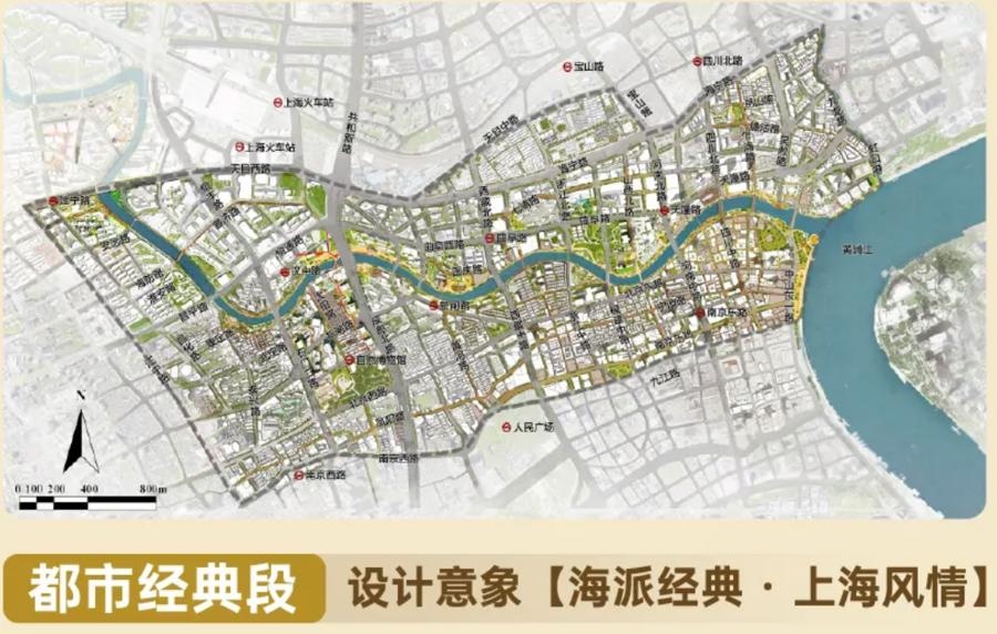 都市经典段范围在河口—昌平路桥,这一段文化历史资源尤为集中,规划进一步延续文脉、融合公共功能和开放空间,集中展现江河交汇、中西合璧的海派都市风采。