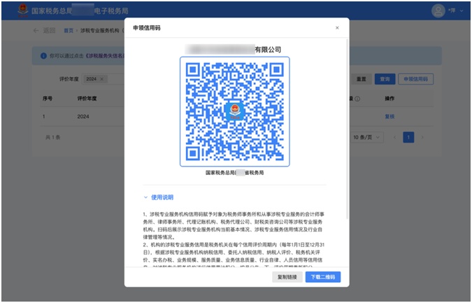 点击【复制链接】,可复制信用码展示的链接,用户可以通过链接查看涉税机构的信息详情。