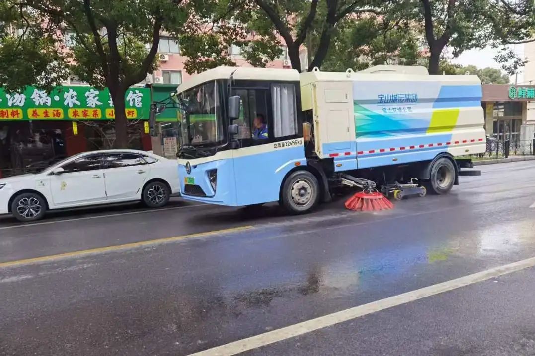 宝山环境卫生服务有限公司对道路进行全面深度清洁。环卫工作人员采用精细化清扫方式,重点清理路面杂物、人行道积尘及绿化带内的垃圾,不放过任何一个卫生死角。同时配合洒水车、洗扫车对道路进行冲洗作业,还原道路本色,提升整体环境品质。