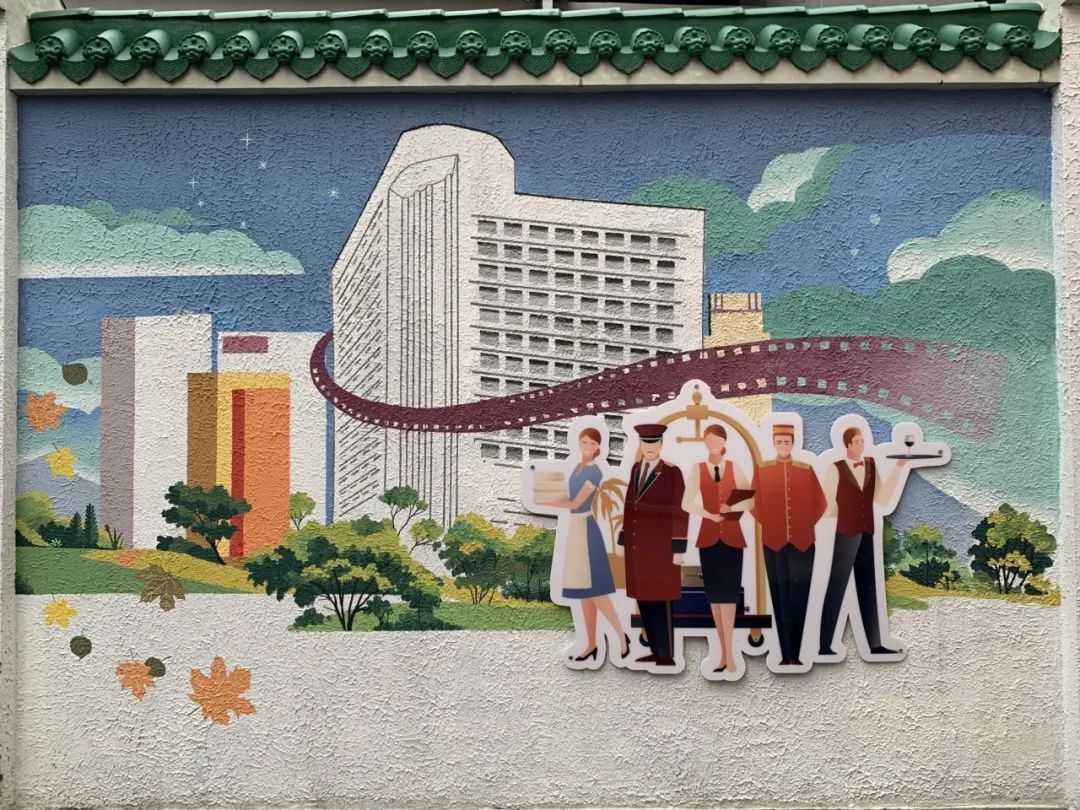新华路不仅有美景,还有沉淀多年的人文气息。第六至第十面墙,就主要聚焦了新华路街道的社区治理与文化传承。第六面墙“美好210”以社区吉祥物小龙人“小灵”为主角,生动展示了居民共同制定的弄堂规约,体现了社区共治共享的活力与潜力;第七面墙“新华路邮政支局”通过老式信筒与智能快递柜的并置,展现了邮递事业的变迁,诉说着通讯方式的演进与时代的进步;第八面墙“上海影城”复刻了影城的建筑外观,唤起人们对新华路电影文化的记忆;第九面墙“银星酒店”展示了酒店美观的主体建筑与服务人员形象,传递出其专业服务精神与街区的人文氛围;以“垃圾分类”为主题的第十幅画,则由社区青少年儿童亲手绘制,传递绿色环保的理念……